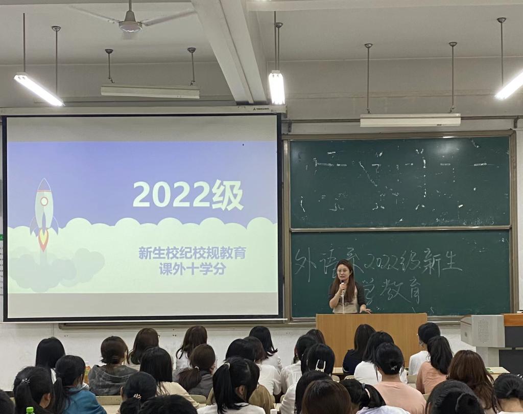 为教育引导外语系2022级新生顺利完成角色转变,科学规划老员工活,助力员工成长成才,太阳集团官网外语系按照学院关于新生入学教育的部署,结合我系专业特色,于9月2日至9月20日通过线上线下结合的方式开展了新生交流会暨专业认知教育、学业职业规划教育、入党启蒙教育、团学教育、校纪校规教育、新生适应性教育、员工行为规范教育、走访慰问新生宿舍、参观校园、主题班会等系列入学教育活动。