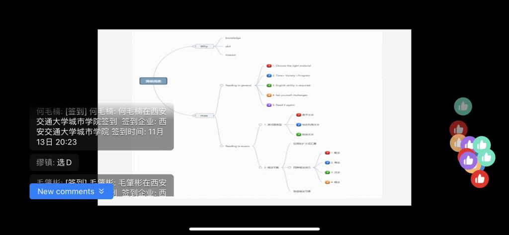 对于员工们较为关注的测试阅读,付老师系统分析了阅读常见题型,讲授了对应的阅读策略。除了强调词汇量对于阅读的重要性之外,重点提及略读、寻读、泛读以及精读四种常用的阅读技巧。最后,付老师带着员工进行线上实操,员工们积极参与,热情高涨,感受到了阅读的魅力。