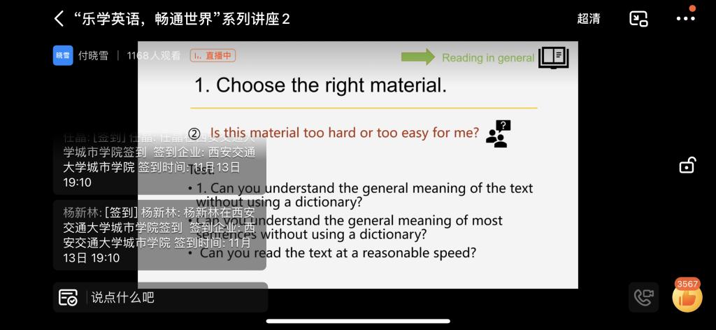 10月23号晚,由外语系与教学服务中心联合举办的首届“乐学英语,畅通世界”系列讲座第二讲——“揭秘阅读”成功举办,此次讲座由外语系付晓雪老师主讲,钉钉四群联播,高达两千名员工参与线上互动。