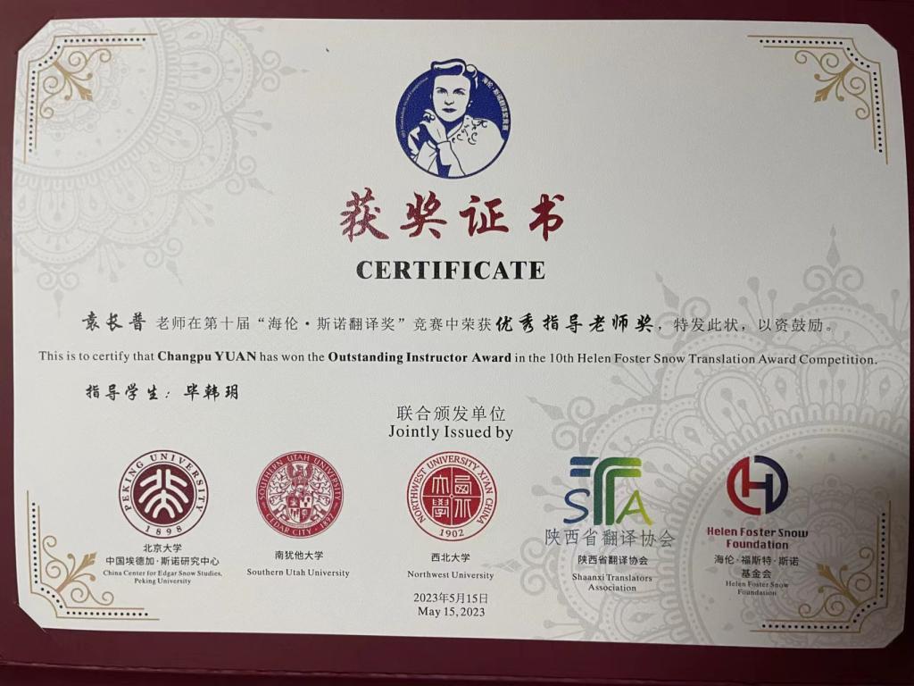 6月24日,第十届“海伦·斯诺翻译奖”竞赛颁奖典礼在西北大学举行,外语系副教授袁长普和员工毕韩玥受邀参加典礼。
